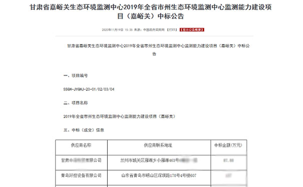 2020年11月19日,甘肅省嘉峪關生態環境監測中心2019年全省市州生態環境監測中心監測能力建設項目(嘉峪關)中標公示,其中項目編號:SSGH-JYGHJ-20-01/02/03/04,中標供應商:青島環控設備有限公司,中標第三包。