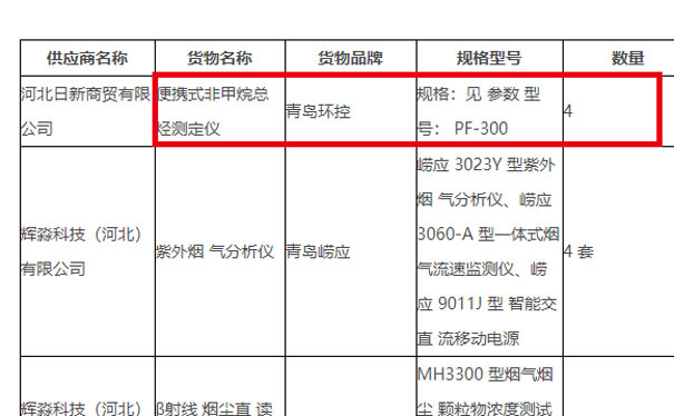 2021年5月25日張家口市環境監測站能力建設(冬奧會賽區環境空氣監測保障能力)項目中標結果公示,采購人:張家口市環境監測站,項目編號為:HBSS2021-007。本次貨物名稱為: 便攜式非甲烷總烴測定儀;貨物品牌:青島環控;規格型號:PF-300。